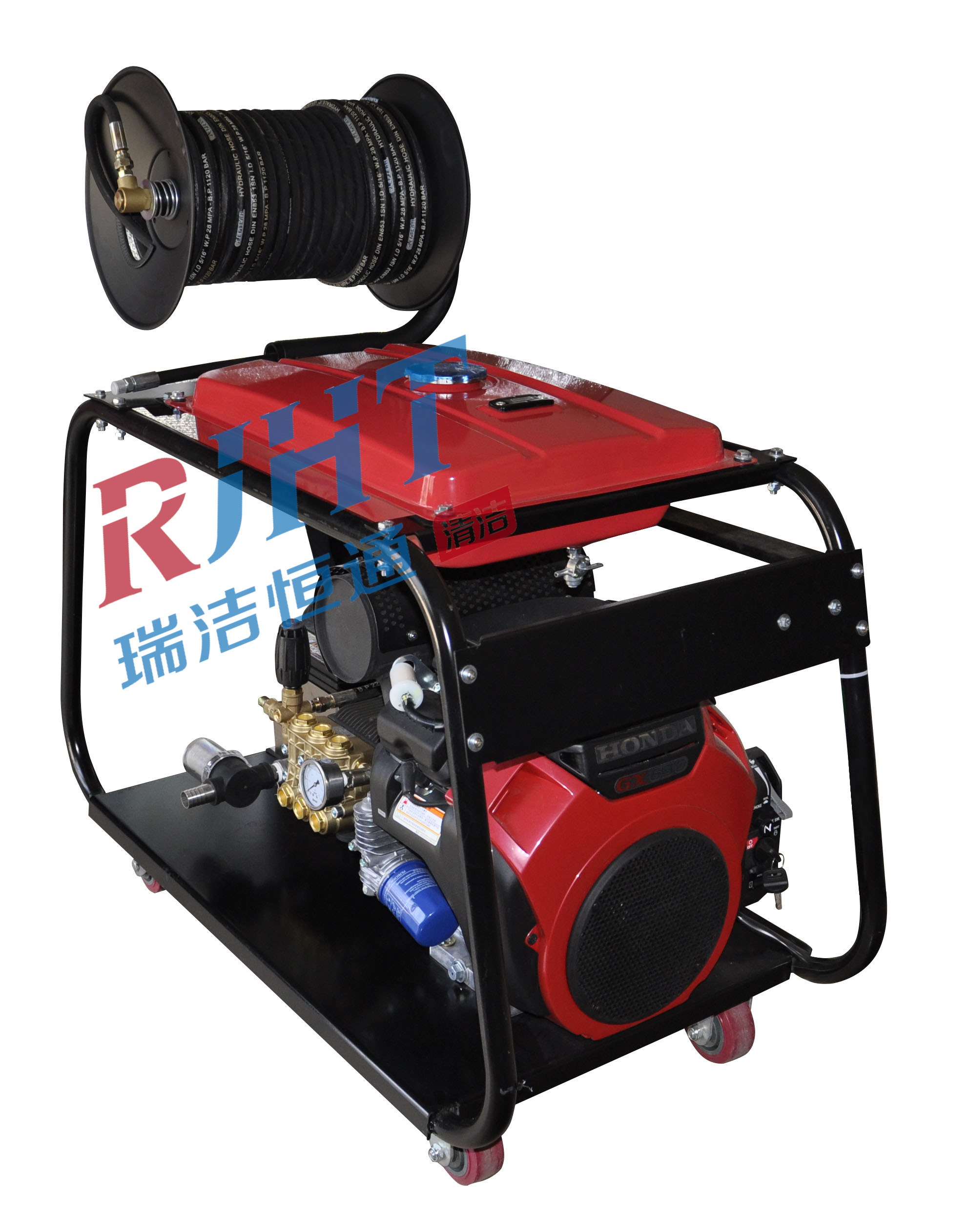 3、對于疏通小區的排水系統有一款非常適合的機器,那就是高壓管道疏通機RJHT-500,主要適用于管道內直徑500mm以下的管道。它是以汽油機或者電機(三相電機)為動力,通過聯軸器傳動,帶動三聯式高壓柱塞泵運轉,把自來水加壓到上百斤甚至幾百公斤,再通過特殊噴頭的噴孔打擊管道內壁上的污垢、淤泥、地溝油等各種雜物。同時反沖洗下來帶出管外。從而達到徹底清洗的目的。這種設備體積小、動力大、疏通清洗能力強、機動靈活、易操作等優點。