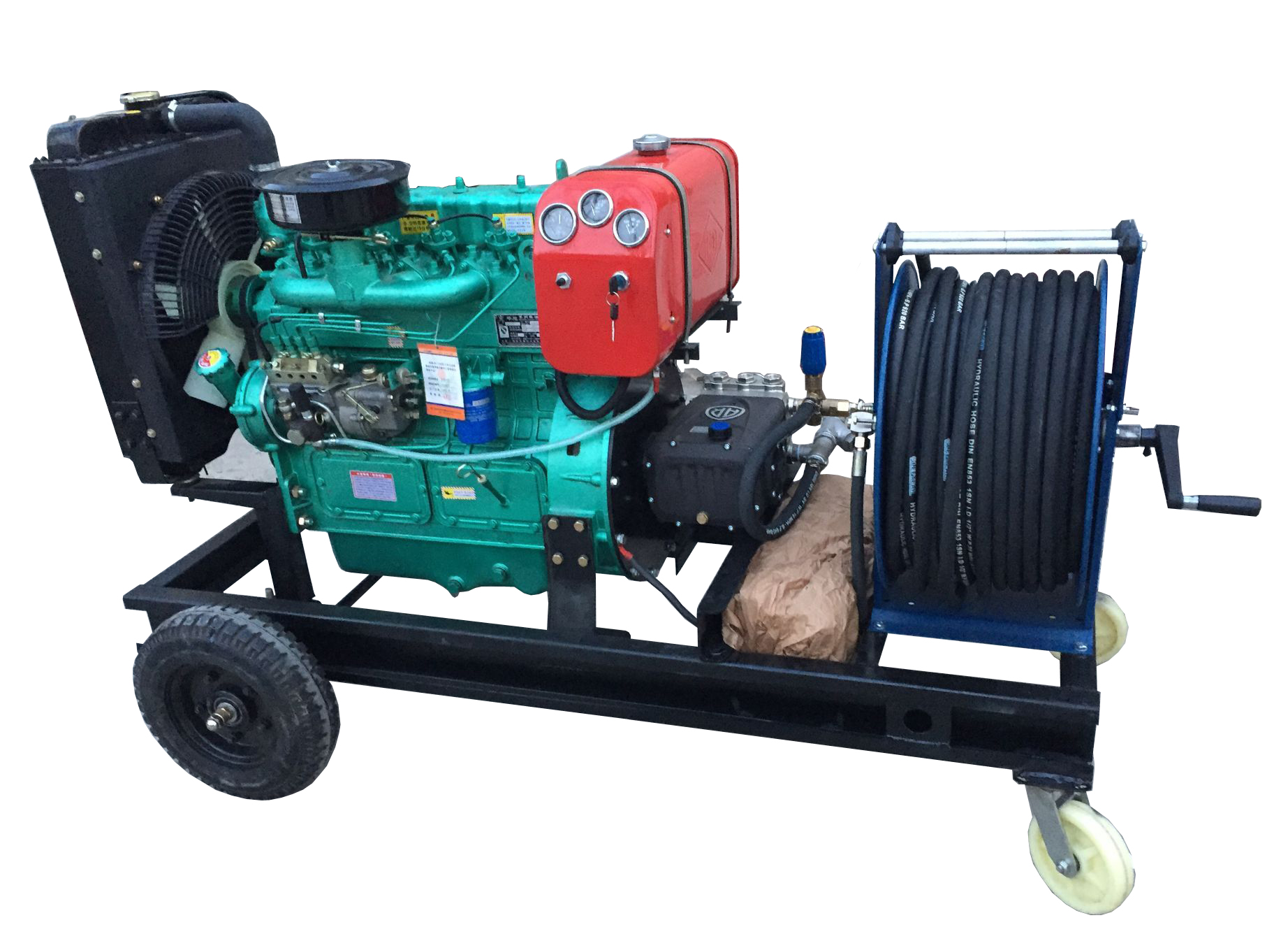 RJHT-60030高壓疏通清洗機,壓力300bar,流量每分鐘30升,78馬力柴油機驅動,重量680KG,尺寸2米*0.8米*1.5米。