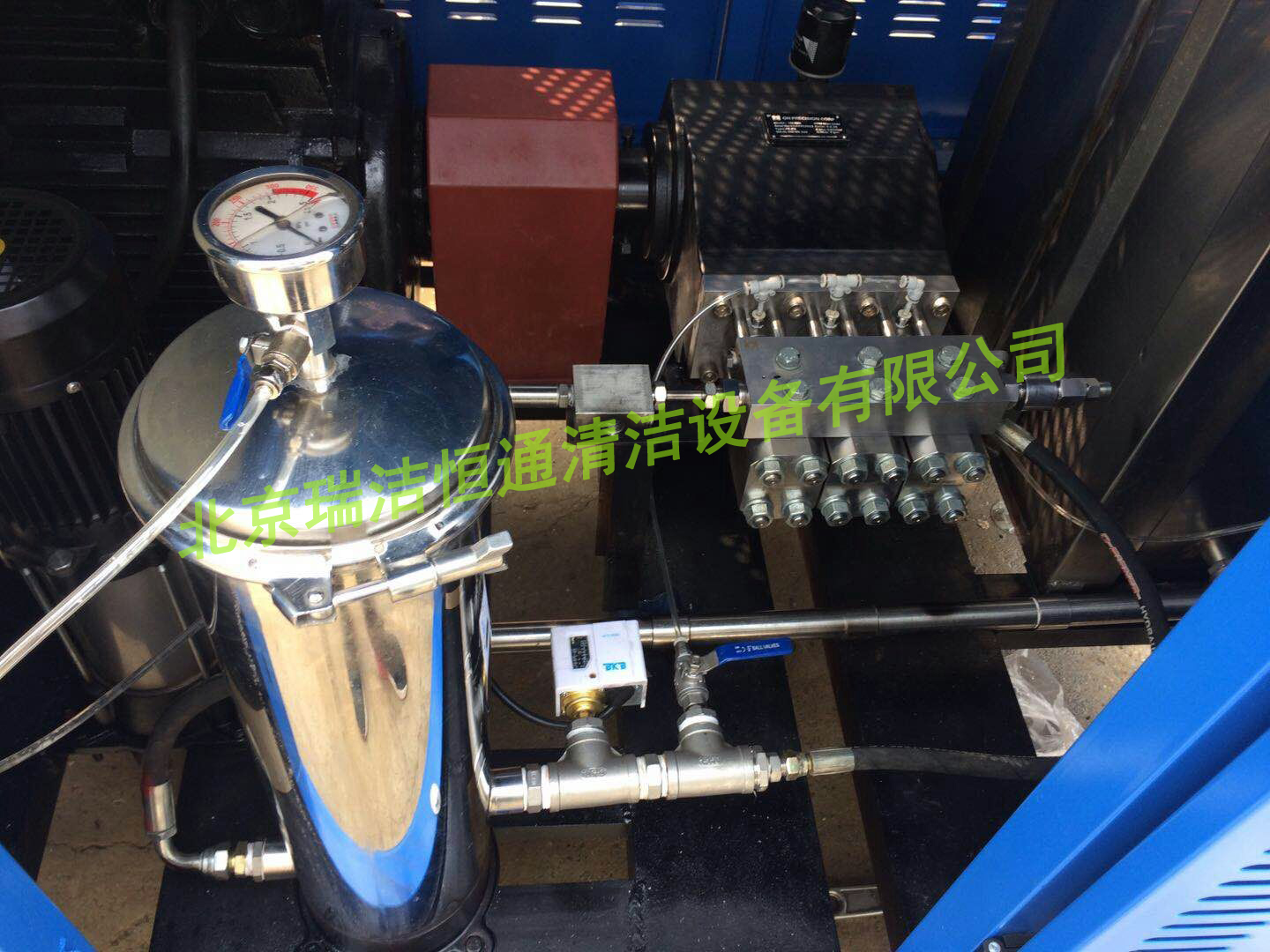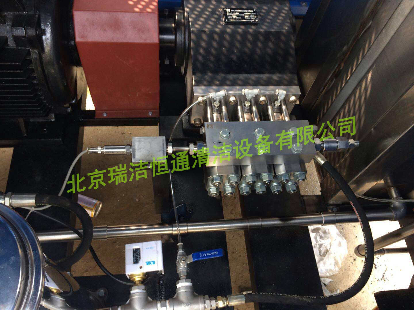 該超高壓清洗機RJHT-2000型,壓力2000公斤,流量20L/min,采用美國進口2000bar高壓柱塞泵、70KW變頻電動機、200L不銹鋼過渡水箱、布袋式不銹鋼進水過濾器、不銹鋼耐震壓力表、250MPa美國進口安全閥、2000Bar手持噴槍、2000Bar旋轉噴嘴和250MPa高壓膠管。